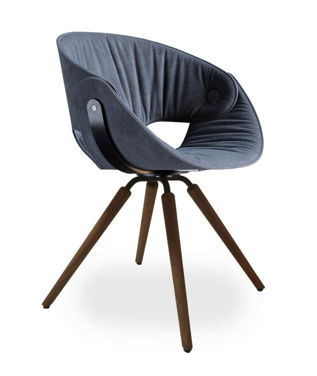 Materials: Inner structure in stratified technical material. Base in solid oak or black American walnut. Upholstered with fabric or leather. Optional swivel or swivel with memory return.