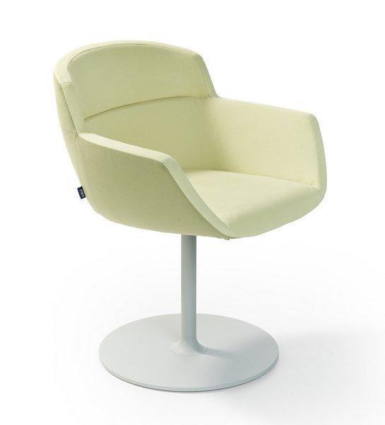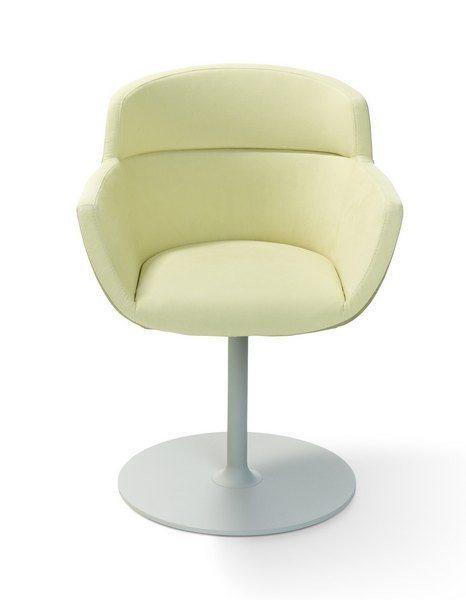 Materials: Metal disk base with powder coat finish. Swivel with return mechanism. Seat shell upholstered with fabric or leather.